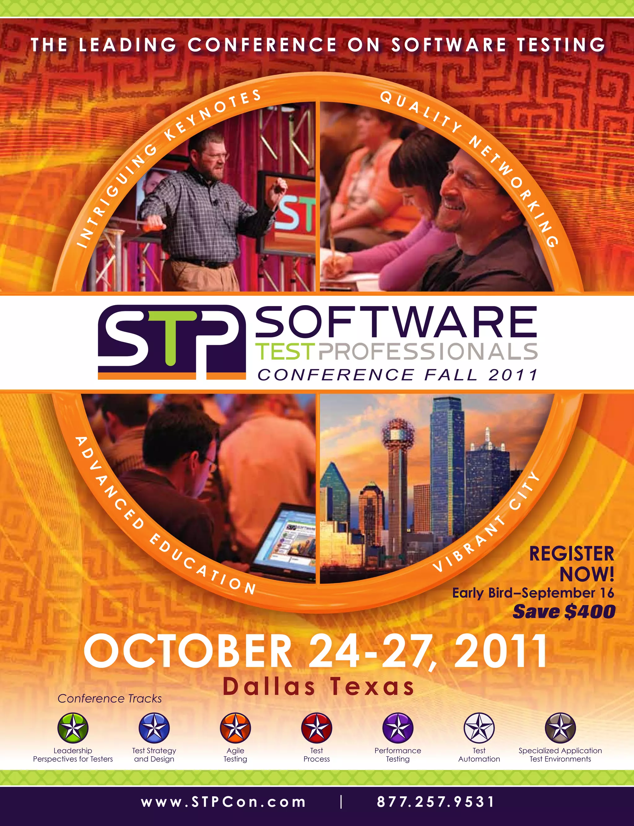 The Software Test Professionals Conference will be held October 24-27, 2011 in Dallas, Texas. It is a leading conference on software testing that will feature 40 information sessions, keynote speeches, and networking opportunities. Topics will include test strategy, agile testing, performance testing, and more. Early bird registration is available until September 16th to save $400 on registration fees.