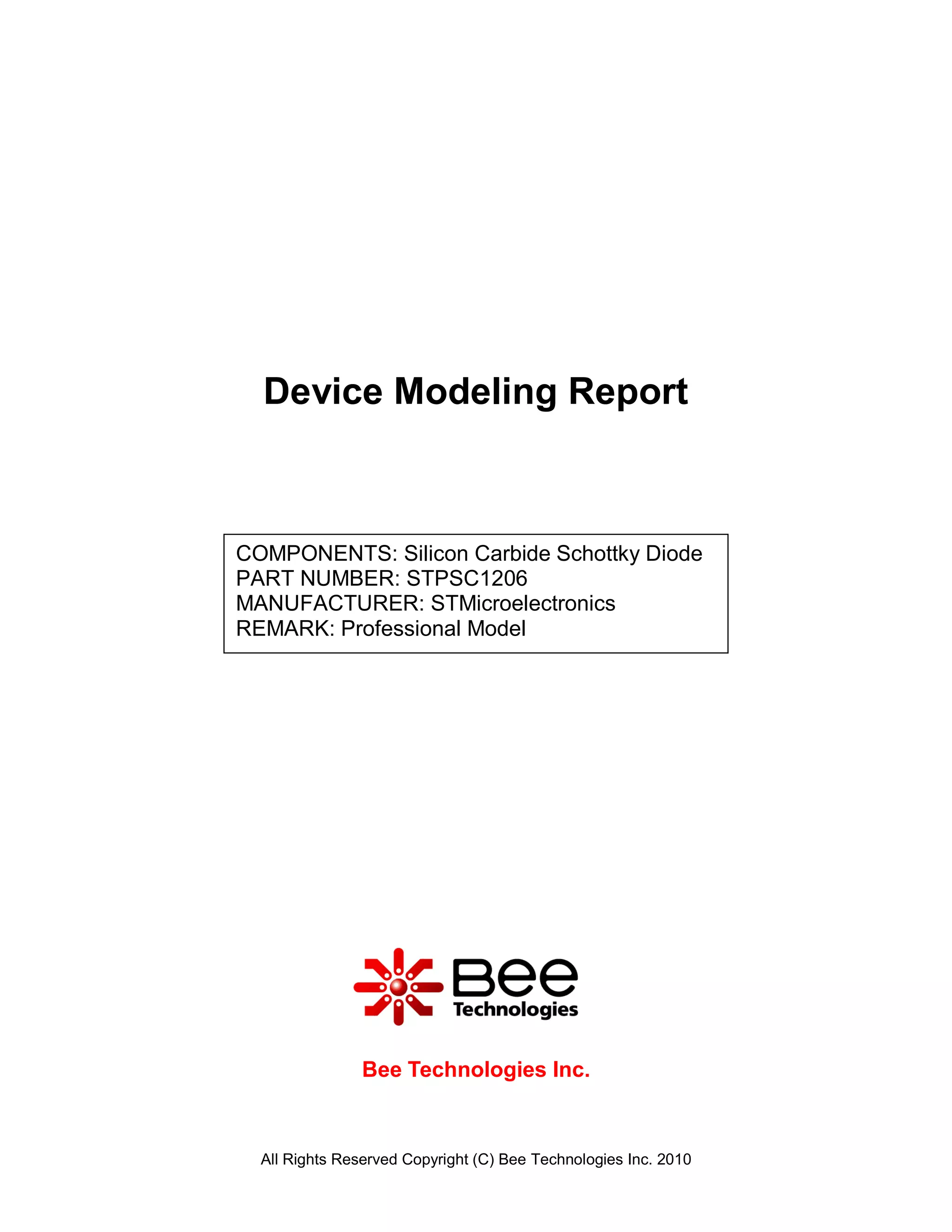 This document provides a device modeling report for the STPSC1206 silicon carbide Schottky diode manufactured by STMicroelectronics. It includes detailed parameters for the diode's PSpice model, simulation results for forward current characteristics, junction capacitance, and reverse characteristics, comparing simulation data with measurement results. The report also includes graphs illustrating the performance of the diode at various current and voltage levels, showcasing the accuracy of the simulation against actual measurements.