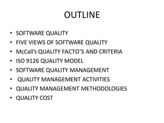 This document provides an overview of software testing, focusing on quality definitions, testing principles, roles, limitations, and various testing types. It elaborates on quality models, including McCall's and ISO 9126, as well as quality management activities and costs. The document emphasizes the importance of verification and validation in ensuring software quality throughout the development lifecycle.