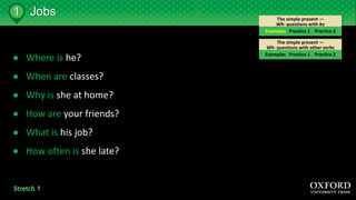 This document provides examples of questions using the simple present tense in English. It includes questions using the verb "to be" as well as questions using other verbs. There are prompts to form questions and practice forming wh- questions in the simple present tense.