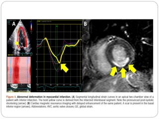 This document discusses strain and strain rate imaging techniques used to quantify regional myocardial function. It describes various methods to measure strain, including tissue Doppler, 2D speckle tracking, and cardiac MRI. It outlines normal values and patterns of strain in healthy individuals and how strain is altered in various cardiac diseases, such as coronary artery disease, heart failure, cardiomyopathies, and congenital heart disease. Strain imaging can identify myocardial scar, viability, dysfunction, and response to treatments.