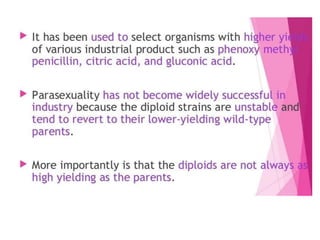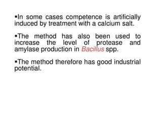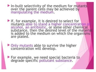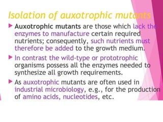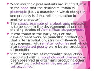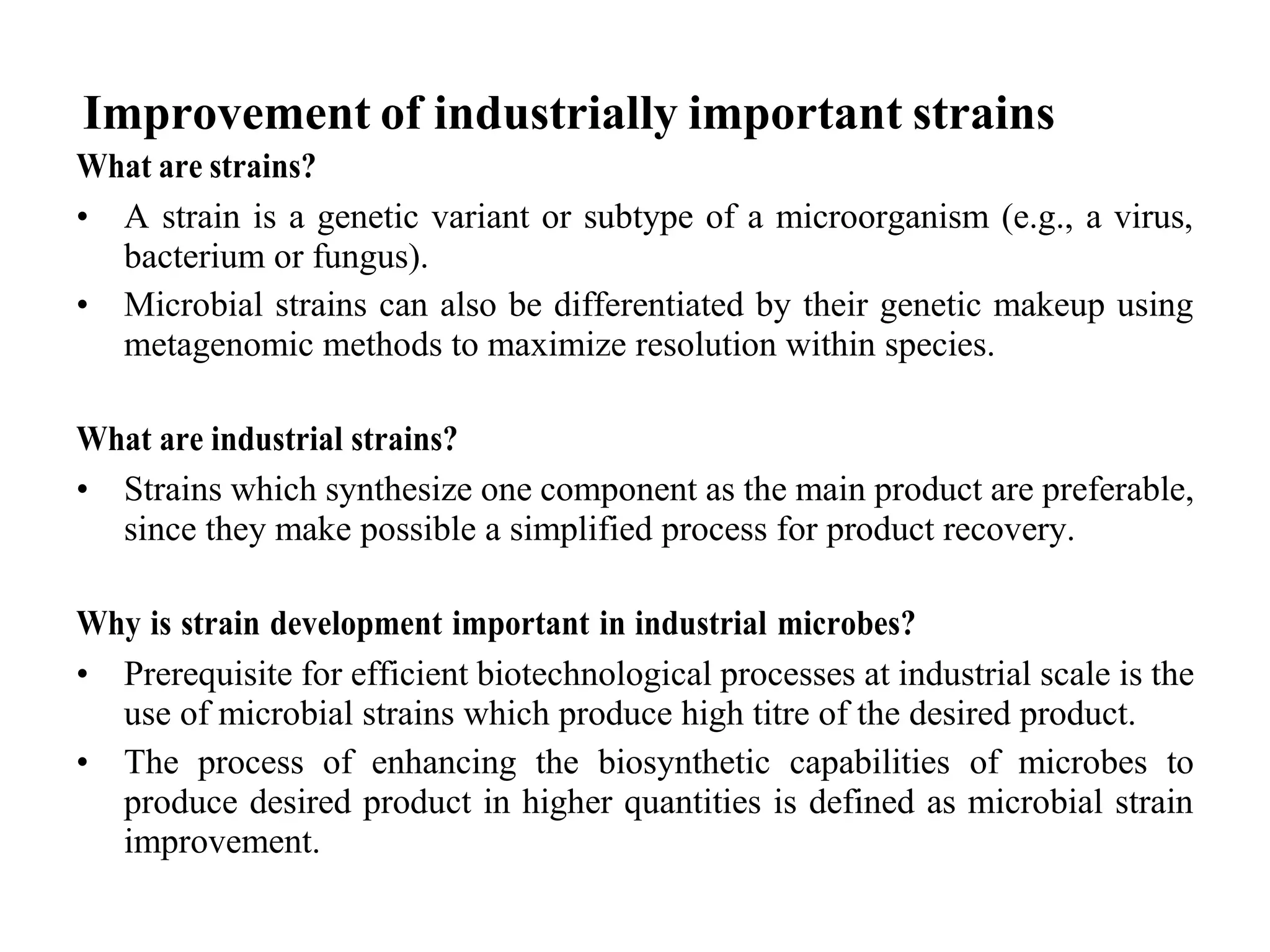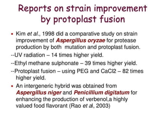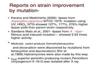 This document discusses strain improvement for industrial microbes. It defines strains as genetic variants of microorganisms and industrial strains as those that synthesize a main product to simplify production. Strain development is important for efficient bioprocesses as it enhances microbial biosynthesis of desired products at high titers. Methods of strain improvement discussed include mutation, recombination techniques like transduction and transformation, and recombinant DNA technology like genetic engineering to alter microbial genetics.