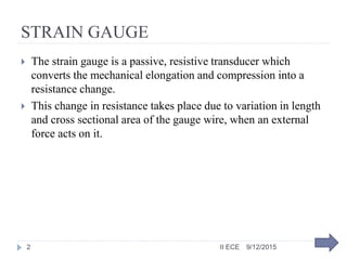 The strain gauge is a passive resistive transducer that converts mechanical strain into a resistance change. When an external force acts on the gauge, it changes the length and cross-sectional area of the gauge wire, altering its resistance. There are two main types: unbonded gauges, where the wire is stretched between points in air or another medium, and bonded gauges, where a fine wire grid is bonded to a carrier and then to the object under test. The resistance change is measured using a Wheatstone bridge circuit, which provides an output voltage proportional to the input strain and hence the applied force.