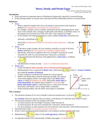 This document discusses stress, strain, and strain gages. It defines stress as force per unit area and strain as the ratio of deformation to original length. Hooke's law states that for elastic materials, stress is proportional to strain. A strain gage consists of a wire attached to a backing that changes electrical resistance with applied strain. However, the resistance change is very small, so a Wheatstone bridge circuit is used to precisely measure the resistance change, allowing calculation of the applied strain.