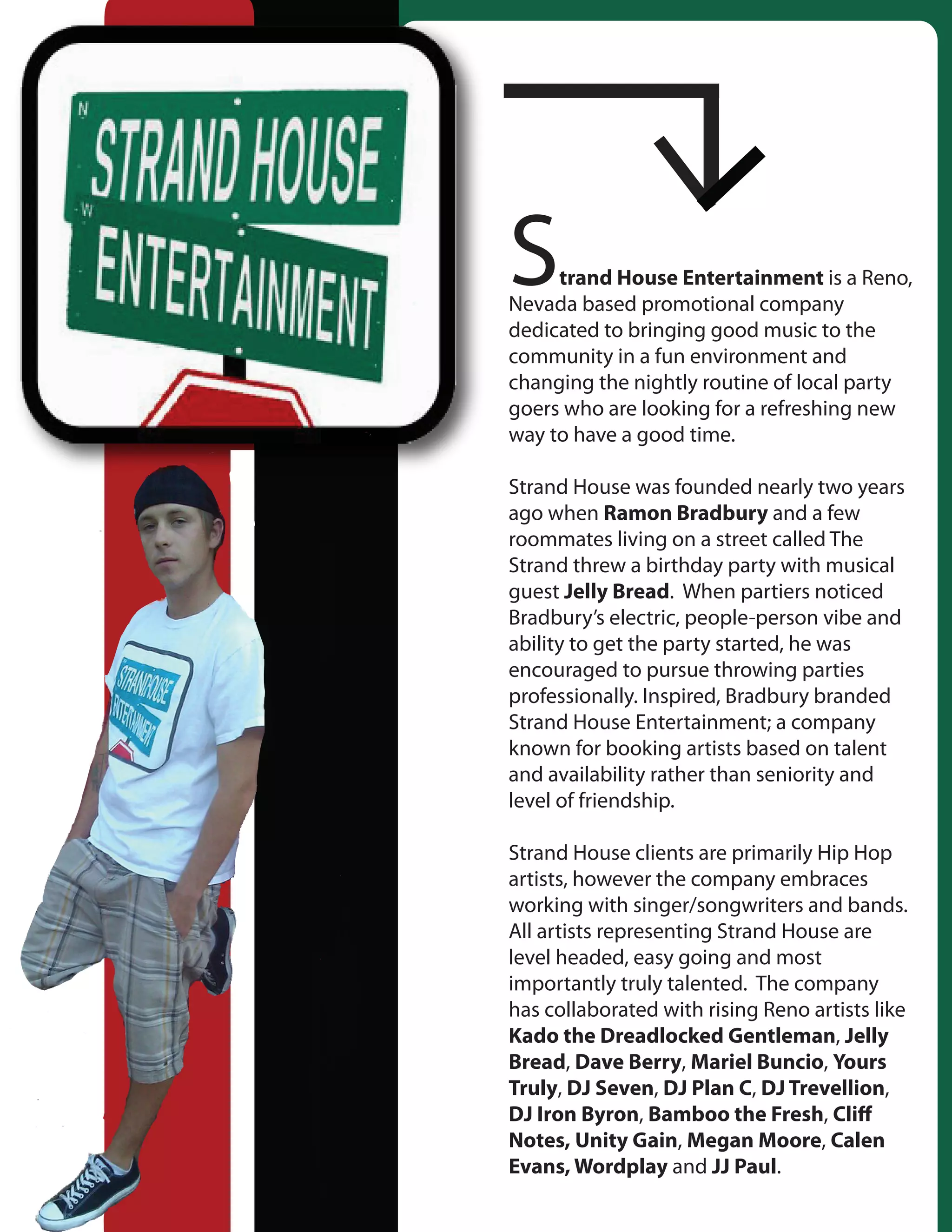 Strand House Entertainment is a promotional company in Reno, Nevada that was founded two years ago to bring good music to the community in a fun environment. It was started by Ramon Bradbury after a successful birthday party with a musical guest. Strand House books talented artists across genres like hip hop, singer-songwriters, and bands. It provides booking, sound, drinks, and promotion for shows at various venues in Reno and California. The company aims to continue expanding and creating enjoyable live music experiences.