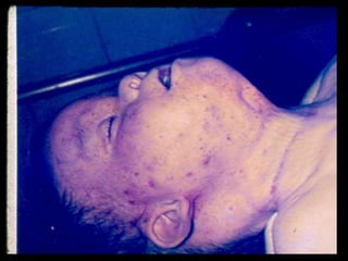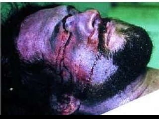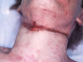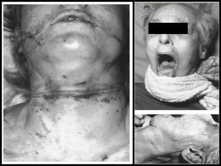 This document discusses strangulation, including definitions, types, signs of asphyxia, ligature strangulation, manual strangulation, and hyoid bone fractures. It defines mechanical asphyxia and anoxia. Types of strangulation include ligature, throttling, garroting, mugging, and bansdola. Signs of asphyxia include cyanosis, facial swelling, bulging eyes, swollen tongue, bloodstained froth, clenched hands, and ligature marks. Ligature strangulation involves external constriction of the neck by materials like rope or wire. Manual strangulation involves compression of the neck by hands, which can cause hyoid bone or thyroid cartilage fractures. The document outlines differences between