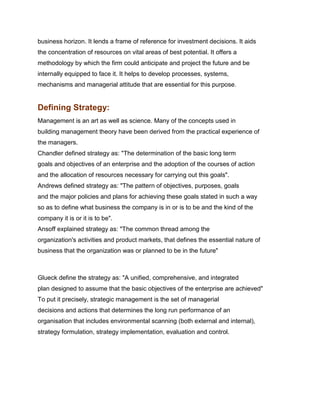 The document provides an overview of strategic management. It discusses key concepts including environmental scanning, strategy formulation, implementation, evaluation and control. For strategy formulation, it describes analyzing the internal/external environment, developing a mission/objectives, and choosing strategies. It also discusses different levels of strategy (corporate, business, functional) and different types of strategies such as competitive strategies. The document is from a management science course and provides definitions and explanations of strategic management principles and processes.