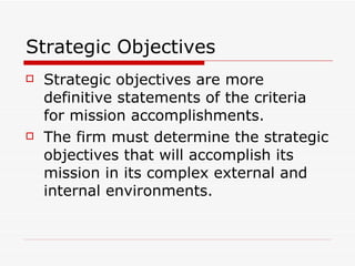 The document discusses strategic objectives and strategy concepts. It defines strategic objectives as more definitive statements that accomplish an organization's mission. Strategic objectives typically have multi-year timeframes and require efforts from multiple departments. Effective strategic objectives are measurable, achievable, flexible, and stretch employees without being unrealistic. The document also defines strategy and discusses the relationship between vision, mission, and objectives. It emphasizes that strategy involves making explicit choices about customers, offerings, and activities.