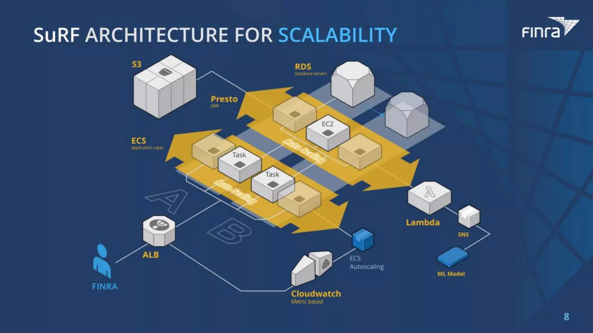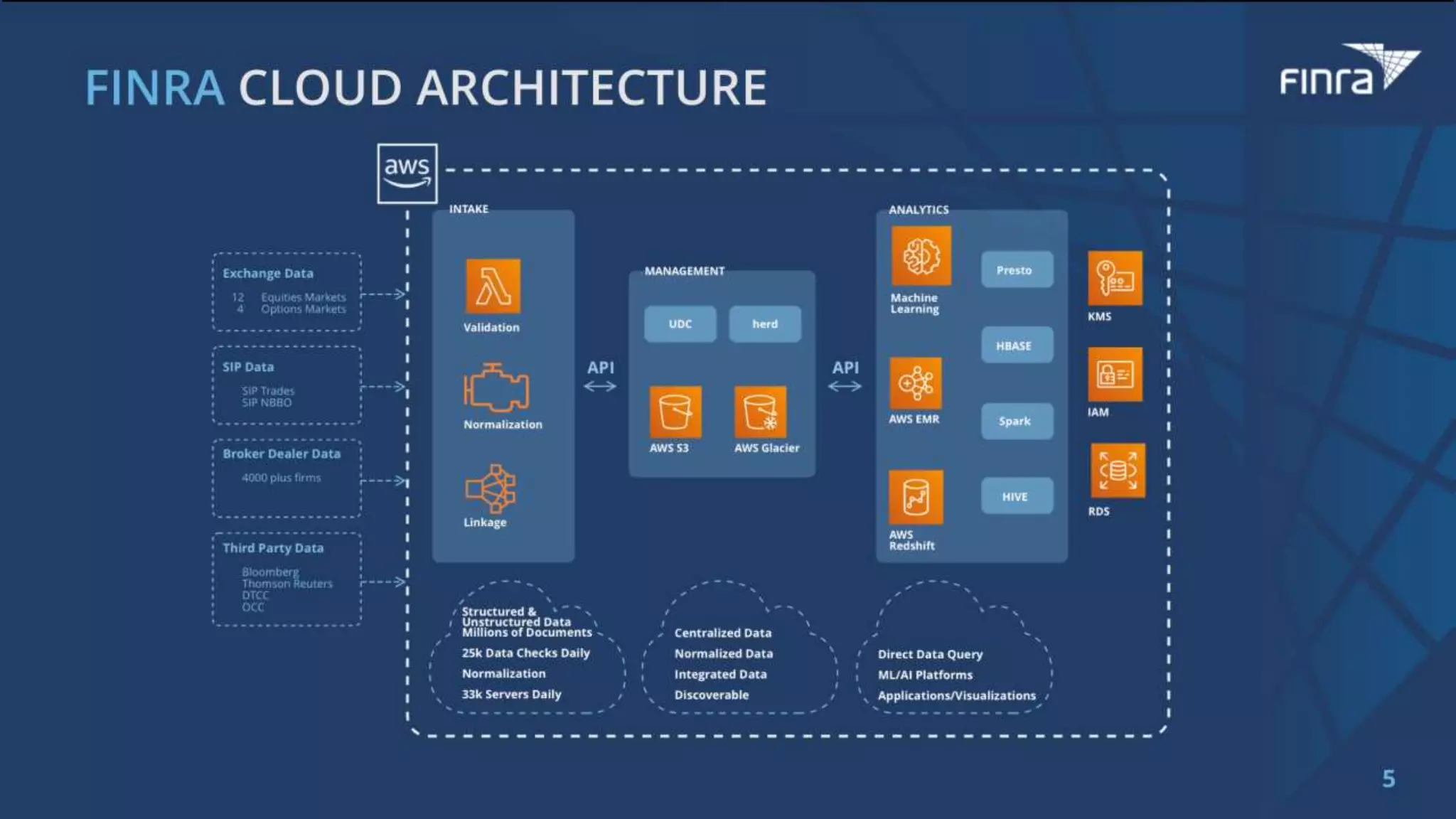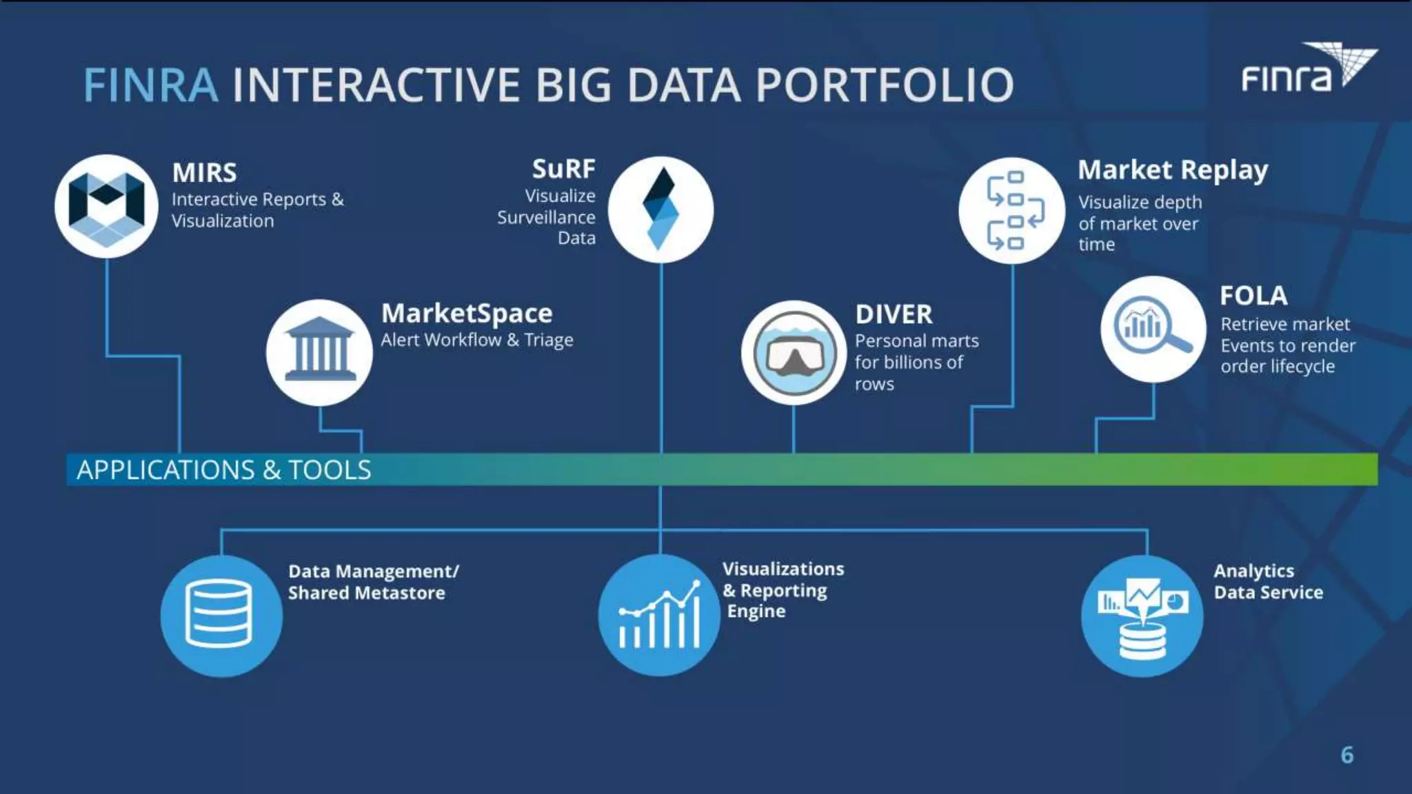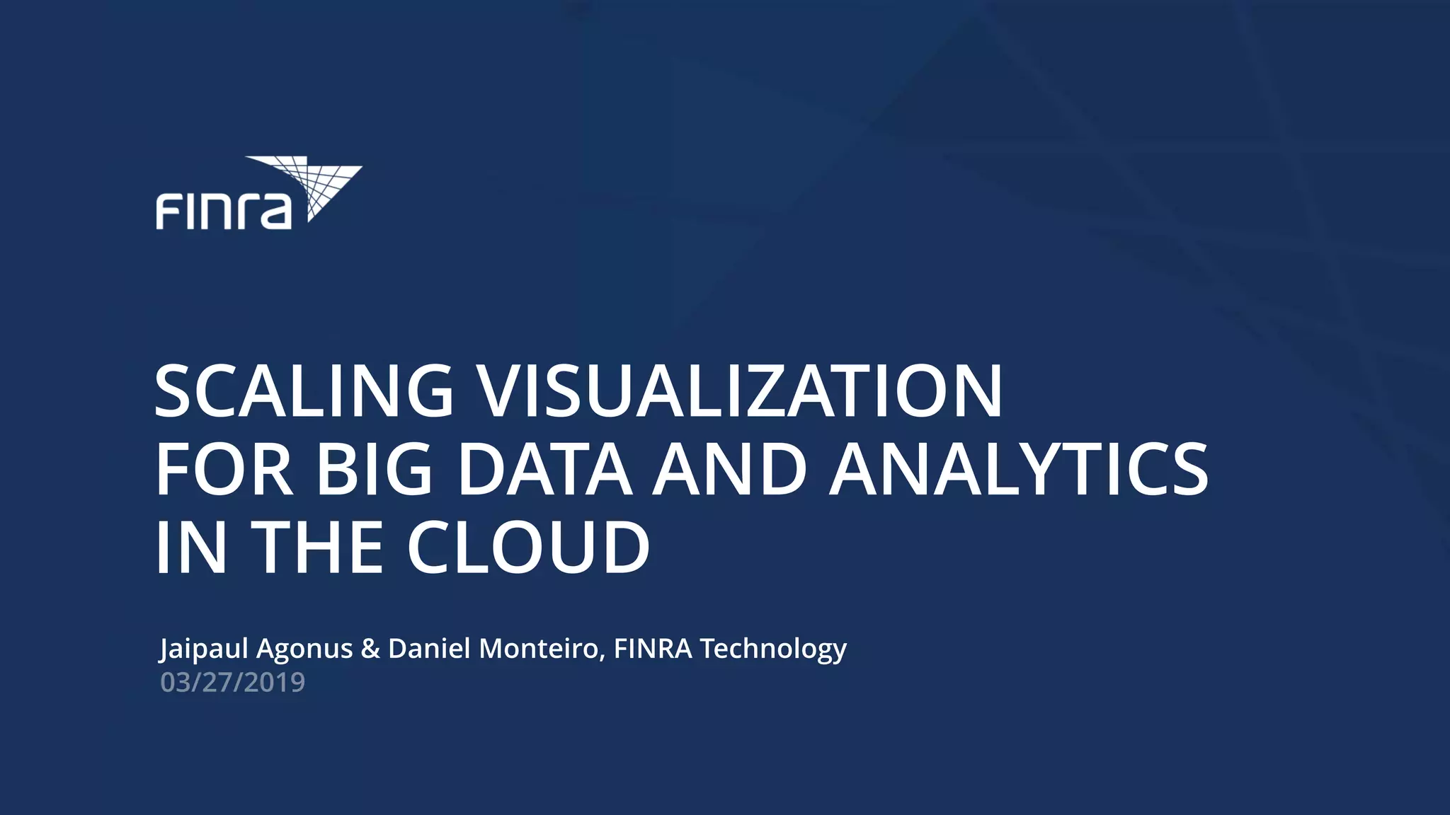 The document discusses how FINRA utilizes cloud technologies and data visualization techniques to enhance market surveillance and analysis. Key points include scaling challenges, interactive data access, visual analysis methods, and the fundamental importance of visual representation in interpreting complex data. It emphasizes the need for effective visualization to identify patterns, outliers, and relationships in large datasets.