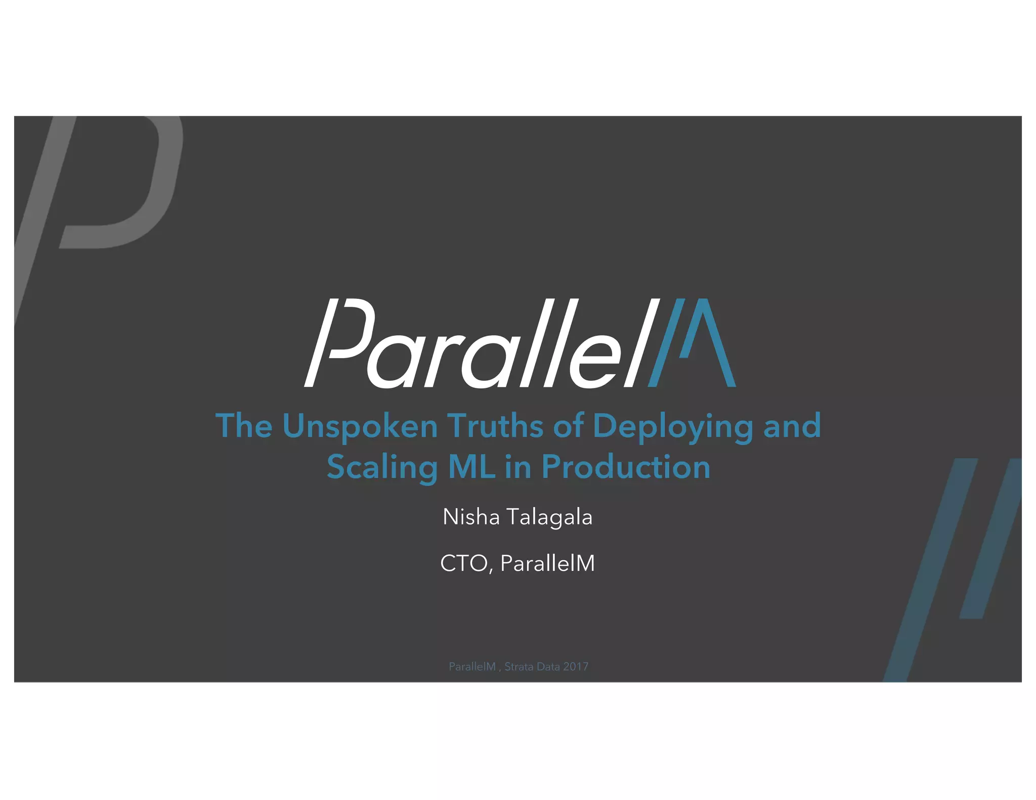 The document discusses the challenges of deploying and scaling machine learning (ML) in production, highlighting issues such as dataset dependency, the complexities of training and inference processes, and collaboration between teams. It presents an approach called MLOps that aims to facilitate pipeline visualization, orchestration, and the management of distributed ML environments. The importance of monitoring ML predictions and adapting to changing data is emphasized, along with the introduction of integration techniques with analytics engines like Spark and TensorFlow.