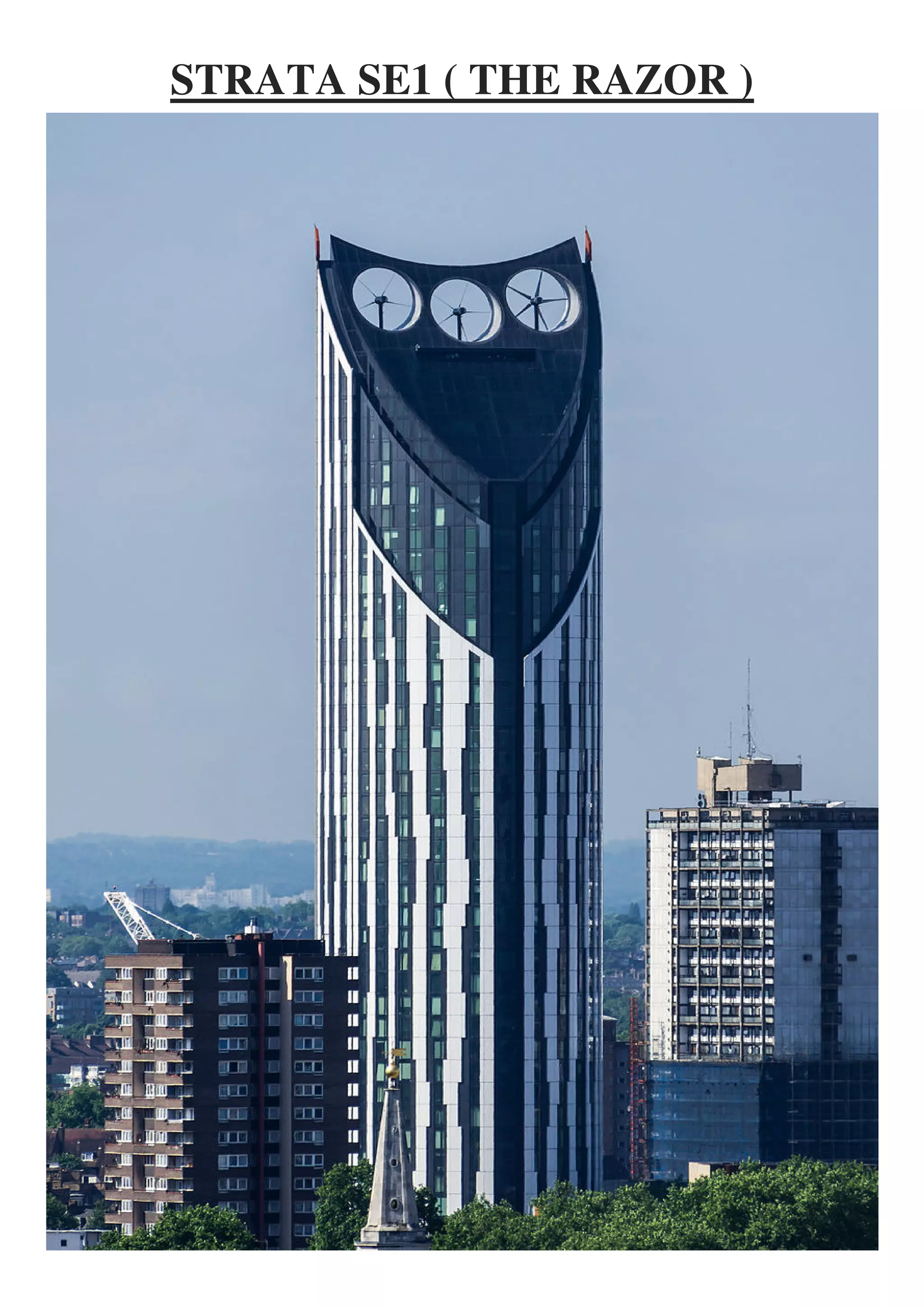 Strata SE1, nicknamed the "Razor", is a 148-meter, 43-story residential building in London completed in 2010 at a cost of over 113 million pounds. It contains over 1,000 residents in its 408 flats. Notable features include wind turbines that generate electricity for common areas, exceeding sustainability regulations by 13% and reducing carbon emissions by 15% compared to standards. During construction, a worker was killed in an accident at the previous building on the site.