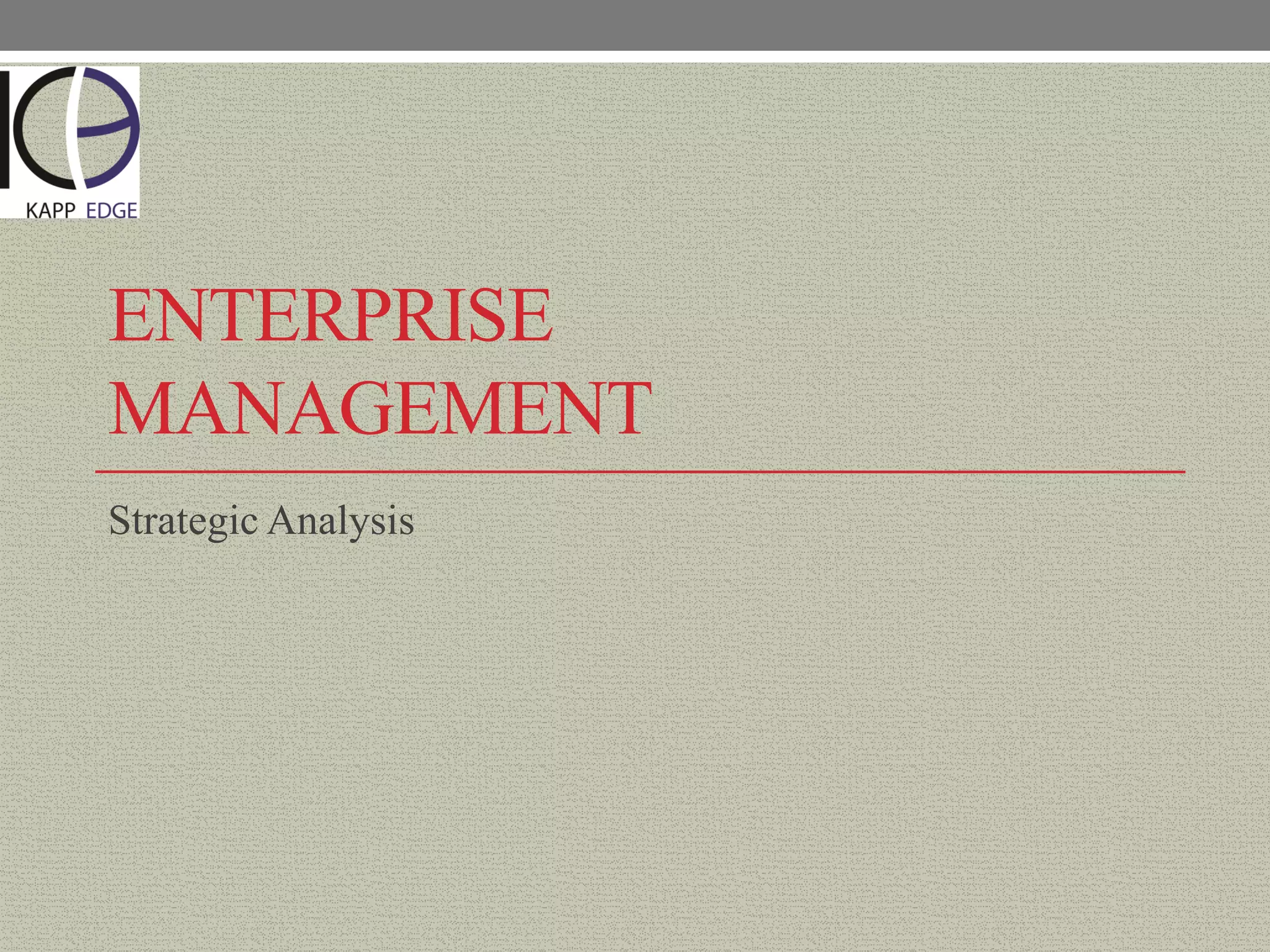 The document discusses strategic analysis tools for enterprise management. It covers external analysis including PESTEL and DEEPLIST frameworks to analyze political, economic, social, technological, environmental, and legal factors. Porter's Five Forces model is also discussed to analyze competitive rivalry, threat of substitution and new entry, supplier power, and buyer power. Internal analysis tools covered include resource audit and identifying core competencies. Porter's Value Chain model is presented for analyzing primary and support activities.