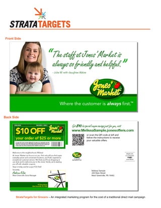 StrataTargets offers grocery stores an integrated marketing program that includes direct mail, digital advertising, and in-store promotions for the cost of a traditional direct mail campaign alone. The program aims to reach both new and existing customers across multiple channels to drive more traffic and sales. Customers are segmented based on demographics and purchasing behaviors to deliver the most relevant messages through the most effective channels.