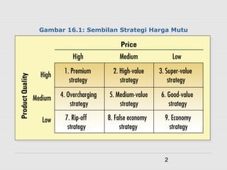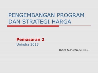 Dokumen ini membahas pengembangan program dan strategi penetapan harga pemasaran, termasuk langkah-langkah dalam memilih tujuan harga, menentukan permintaan, memperkirakan biaya, dan memilih metode penetapan harga. Berbagai strategi harga dibahas seperti harga penetrasi pasar dan harga premium, serta faktor-faktor yang memengaruhi kepekaan harga di pasar. Selain itu, terdapat penjelasan tentang penyesuaian harga dan strategi psikologis dalam pemasaran.