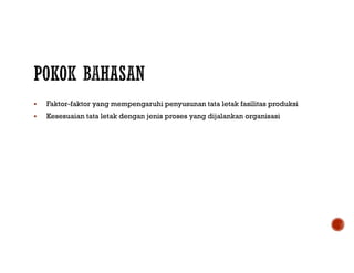 Dokumen tersebut membahas tentang manajemen operasi khususnya mengenai tata letak fasilitas produksi. Beberapa poin penting yang dijelaskan adalah faktor-faktor yang mempengaruhi penyusunan tata letak, jenis-jenis tata letak seperti berorientasi proses, produk, dan lainnya beserta contoh penerapannya. Tujuan utama pengaturan tata letak adalah mencapai efisiensi biaya dan kinerja yang optimal.