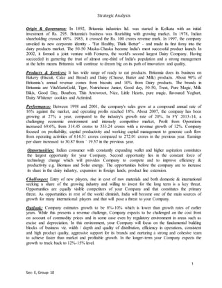 This document provides an analysis of Britannia Industries Ltd, a leading Indian food company. It discusses Britannia's origin, products, performance, opportunities, challenges, and strategies. An external analysis using PESTEL and Porter's Five Forces models examines factors impacting the bakery and dairy industries in India. Britannia faces competition but has achieved growth and market share through quality, trust, and innovation. The company aims to further expand its business and capture market opportunities both domestically and abroad.