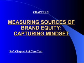 The document discusses strategies for measuring brand equity through qualitative and quantitative research techniques. It describes methods like free association, projective techniques, and brand personality assessments that can be used to understand brand associations. It also outlines approaches for measuring awareness, image, brand responses, and brand relationships through surveys. The goal is to capture consumer mindset and understand how branding strategies can build equity at different levels of a brand hierarchy.