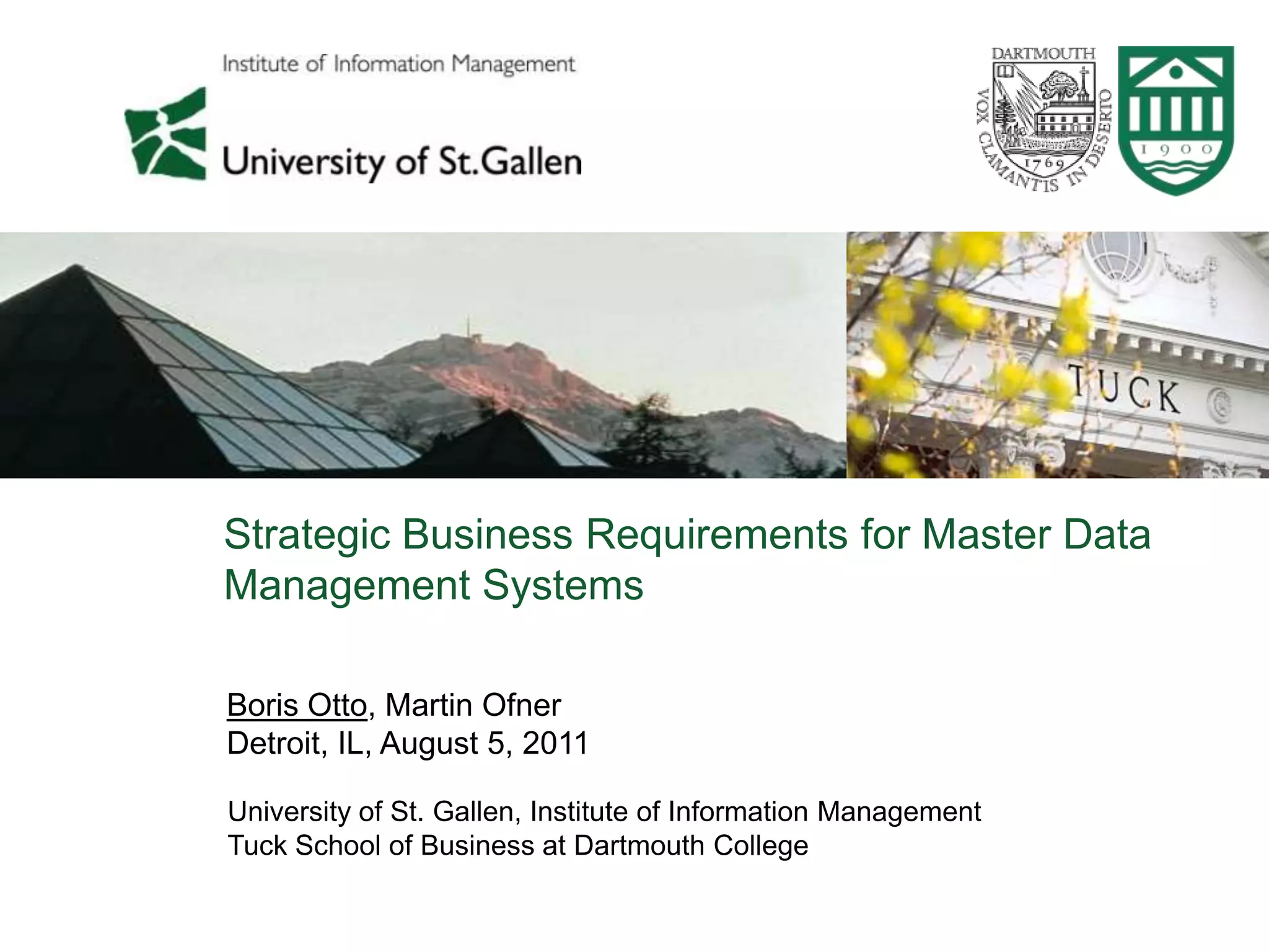 The document outlines the strategic business requirements for master data management (MDM) systems, addressing user uncertainties and divergent expectations in MDM initiatives. It provides a framework for improving communication between companies and software vendors, highlighting design principles and essential requirements for effective MDM systems. The research emphasizes the importance of delivering high-quality master data and offers insights into operational challenges and necessary improvements in current MDM practices.