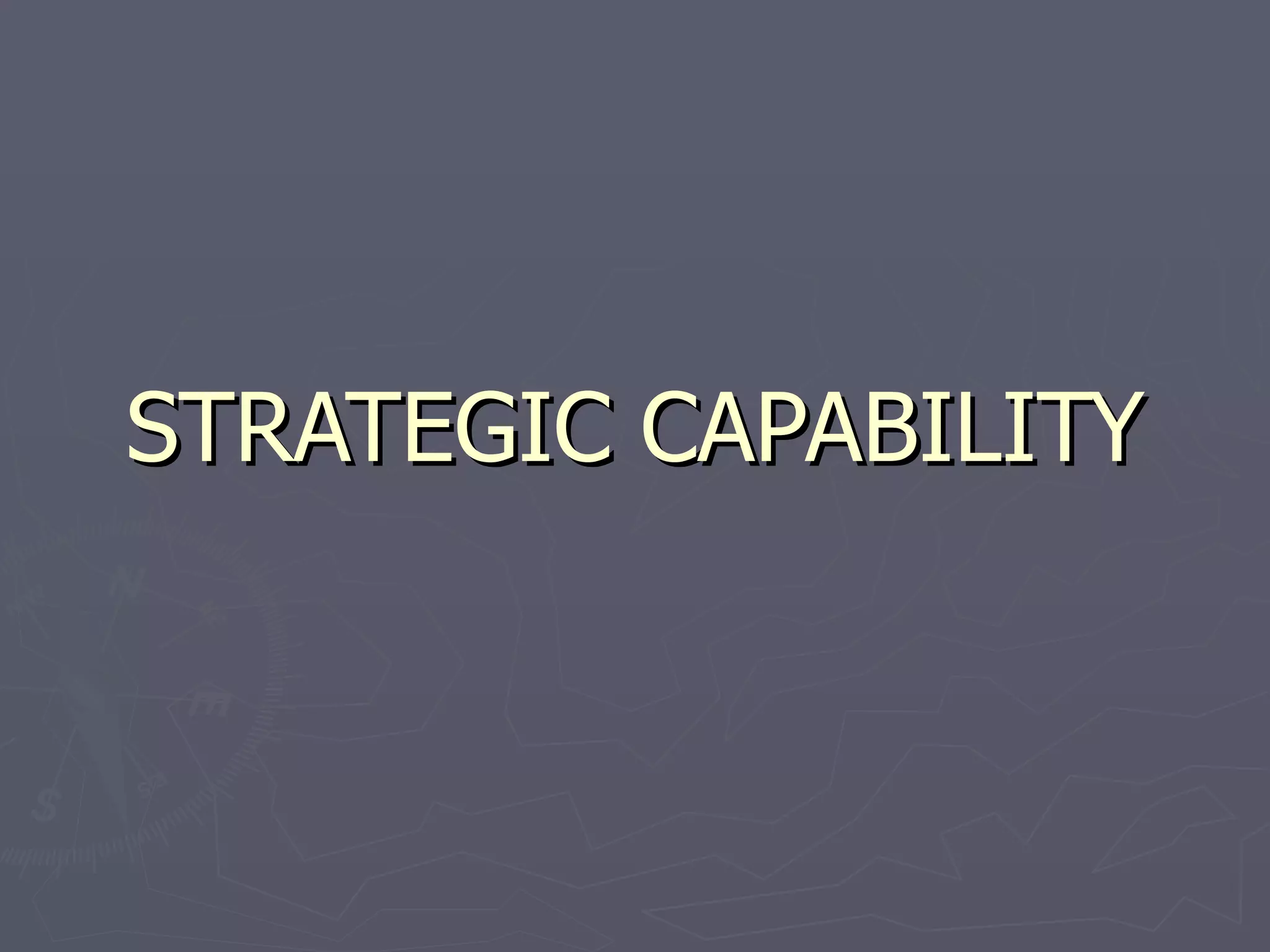The document discusses strategic capability and managing it. It defines strategic capability as the adequacy and suitability of an organization's resources and competencies. It notes that a unique resource that is better than competitors' and difficult to imitate can provide sustained competitive advantage. The document also discusses value chain, product portfolio management, product life cycles, benchmarking, and performing SWOT analysis to appraise organizational strengths, weaknesses, opportunities, and threats.