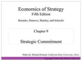This document summarizes key points from Chapter 9 of the textbook "Economics of Strategy" regarding strategic commitment. It discusses how strategic commitments can impact competition by altering rivals' expectations. Commitments are most effective when they are visible, understandable, and credible. Firms must consider whether their actions and those of competitors are strategic substitutes or complements. The value of commitments depends on their direct effects and strategic effects, and commitments can create flexibility or preserve future options depending on the context.
