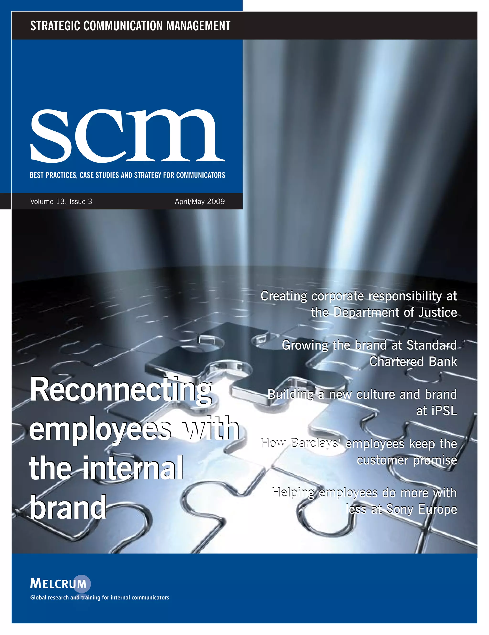 This document provides information about a strategic communication management publication including its editorial board members and how to contact the editors. The publication focuses on best practices, case studies, and strategies for communicators. It includes articles on creating corporate responsibility at the Department of Justice, growing the brand at Standard Chartered Bank, and reconnecting employees with the internal brand at iPSL.