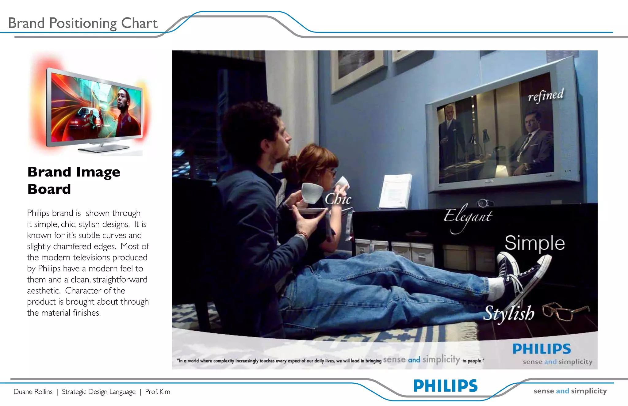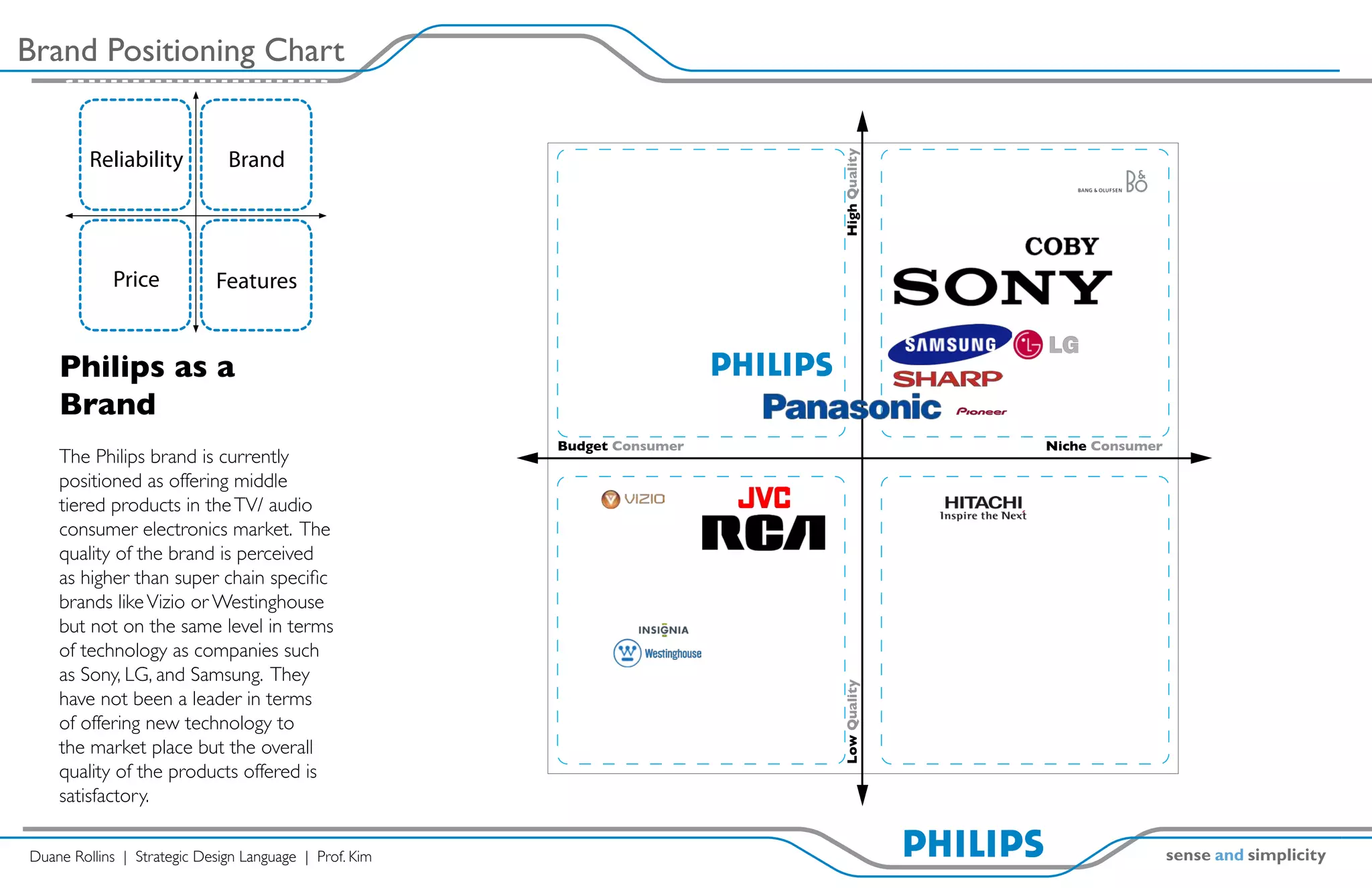 The document provides information on the Philips brand positioning in the TV and consumer electronics market. It describes Philips as currently positioned in the middle tier, offering satisfactory quality products at affordable prices. While not leading in new technology, Philips delivers quality without the high prices of top brands like Sony, LG, and Samsung. There are opportunities for Philips to either dominate the low price point or enter the high-end niche market.