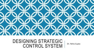 Strategic control involves tracking strategy implementation, detecting problems, and making adjustments. It ensures the organization accomplishes its mission and objectives. The control process determines what to measure, establishes standards, measures performance, and takes corrective action if needed. There are several types of strategic control, including premise control to check assumptions, implementation control to assess strategy execution, and strategic surveillance to monitor internal and external events. Benefits of strategic evaluation include providing direction, maintaining a continuous focus on key performance, and orienting the organization towards the future.