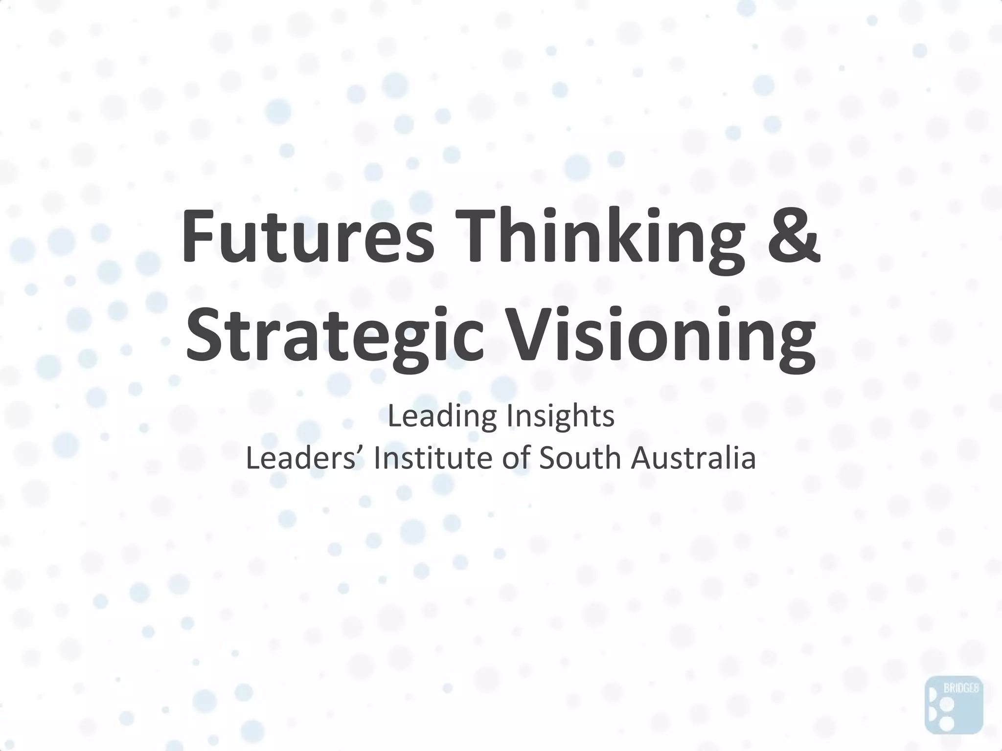 This document provides an overview of futures thinking and strategic visioning. It discusses tools for foresight like causal layered analysis and the futures triangle. It also emphasizes that foresight requires both contemplation to generate insights as well as action to create change. Key aspects of foresight discussed include examining trends, structures, worldviews and underlying narratives to understand the push, pull and weight of different possible futures.