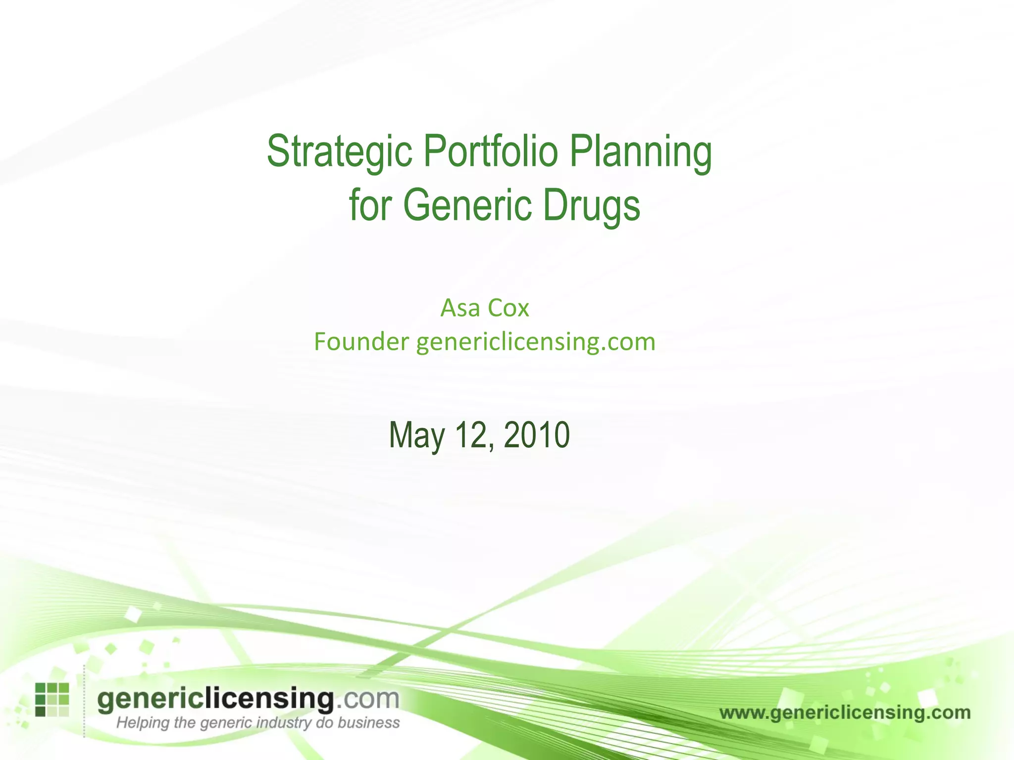 The document discusses the importance of strategic portfolio planning for generic drug companies. It notes that the global generic drug market was worth $83 billion in 2009 and is estimated to reach $129 billion by 2014. Strategic planning is important because the market is very competitive and the largest companies are continuing to grow in size through acquisitions. Companies need to plan which drugs to target for patent expiries, consider manufacturing and distribution channels, and prepare for increased biosimilars competition. Proper portfolio planning is crucial for success in the rapidly growing but challenging generic drug industry.
