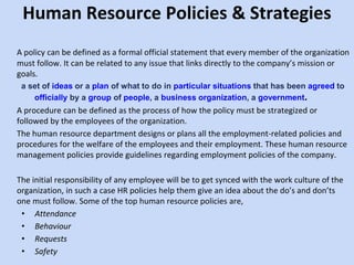 The document outlines the importance of human resource policies and strategies in an organization, defining policies as formal statements that guide employee behavior in alignment with company objectives. It discusses the strategic management process, emphasizing steps such as environmental scanning, strategy formulation, implementation, and evaluation to enhance organizational performance. Furthermore, it addresses the need for a well-defined HR strategy that aligns with business goals and contributes to competitive advantage, organizational culture, and employee development.