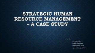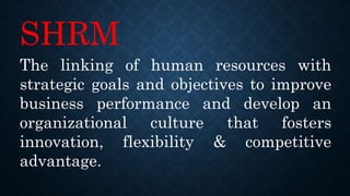 This document provides an overview of strategic human resource management and different theories related to aligning human resources with organizational strategy. It discusses strategic human resource management, the best fit theory, best practice theory, and resource theory. The best fit theory links human resource strategy to the internal environment and categorizes organizations. The best practice theory aims to improve performance through developing employee commitment. The resource theory views an organization's resources as important assets for strategic positioning.
