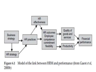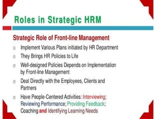 The document discusses the strategic roles of HR management in influencing business performance and implementing HR strategies, highlighting the importance of top and front-line management in achieving integration and supporting HR policies. It outlines several strategic roles for HR, including being a business partner, innovator, change agent, and implementer, while emphasizing the need for continuous transformation and leadership in managing change. Additionally, key success factors in change leadership are identified, focusing on vision, commitment, and progress monitoring.