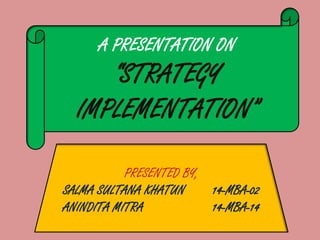 This presentation discusses strategy implementation. It covers the meaning of strategy implementation, management issues like annual objectives and policies, and functional issues in areas like marketing, finance, research and development, and management information systems. Strategy implementation is the action stage of strategic management where the focus is on efficiency and coordination across the organization to achieve objectives.