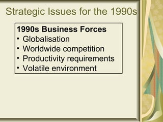 This document discusses strategic issues for information systems planning (SISP) in the 1990s. It notes key business forces of globalization, competition, and productivity requirements. Strategic issues include increased connectivity within and between organizations, as well as new information technology opportunities from advances in networks, databases, and interfaces. SISP aims to align information systems with organizational objectives and strategies in a cost-effective way that provides competitive advantage. It helps prioritize investments, integrate systems, and manage information and relationships between users and IT specialists.