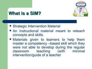 Strategic Intervention Material (SIM) is an instructional material meant to reteach concepts and skills that students were unable to master during regular classroom teaching. A SIM contains several parts: a Guide Card that provides an overview of the lesson; Activity Cards that define tasks for students to practice skills; an Assessment Card to measure skill mastery; an Enrichment Card for additional practice; a Reference Card with extra content; and an Answer Key. Teachers will create SIMs based on their students' least learned skills and be judged on subtasking, congruence, usability, and replicability.