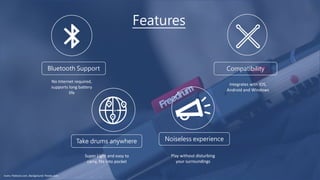 Free Drum is a portable drumming device featuring Bluetooth support, compatibility with multiple platforms, and a noiseless experience. The project was successfully funded on Kickstarter, raising $622,877 from 4,054 backers. It includes accessories like a micro USB charger and straps for enhanced usability.
