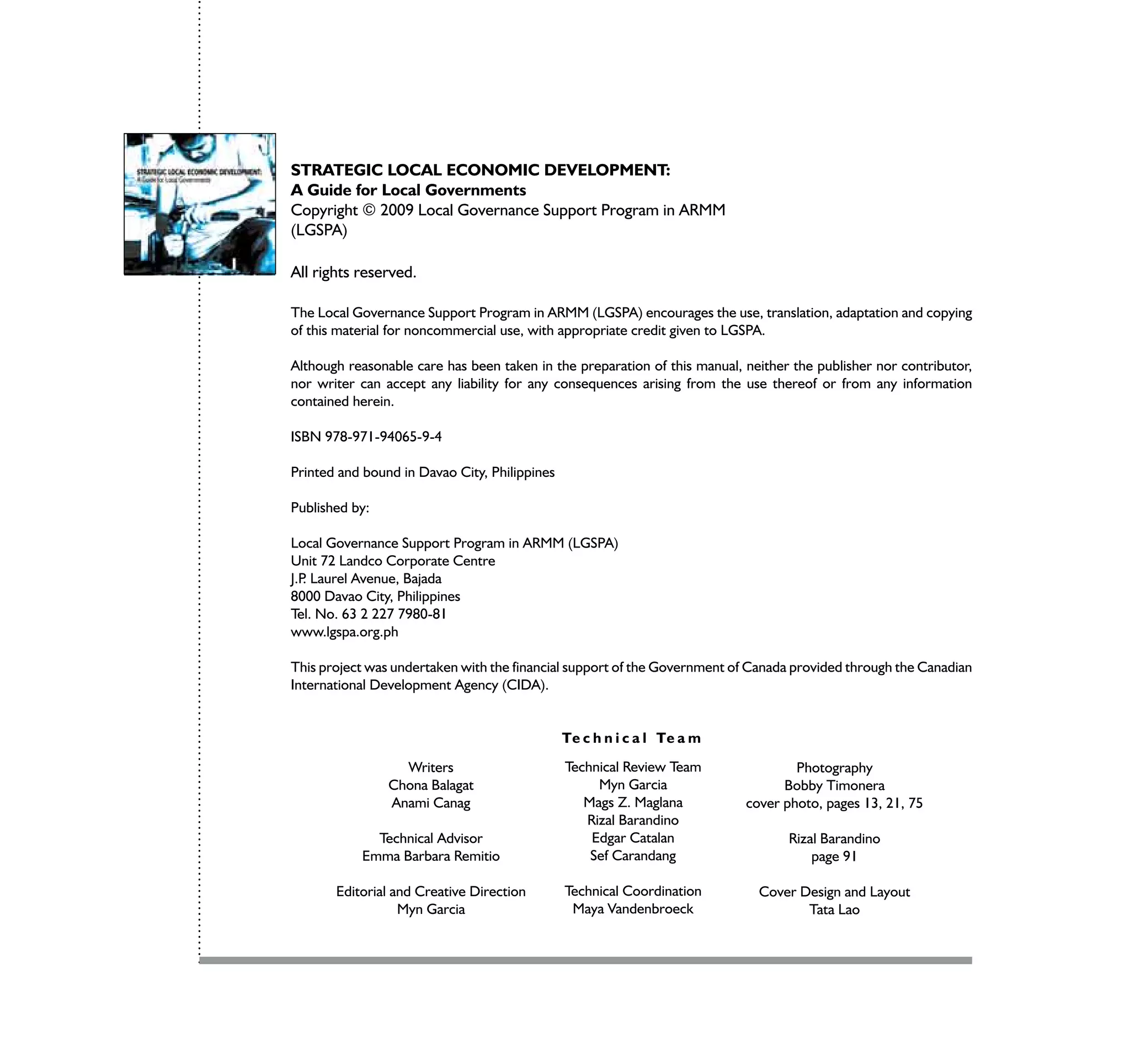 This document provides a guide for local governments to strategically promote local economic development. It discusses integrating local economic development processes into local government functions through a five-stage process: 1) organizing the LED effort, 2) conducting a local economy and competitiveness assessment, 3) formulating an LED strategy, 4) implementing the strategy, and 5) reviewing the strategy. It also features case studies of LED practices in various local governments in the Autonomous Region in Muslim Mindanao that demonstrate how participatory governance can drive economic progress. The guide highlights the importance of collaboration between LGUs, communities, and government agencies to achieve successful LED.