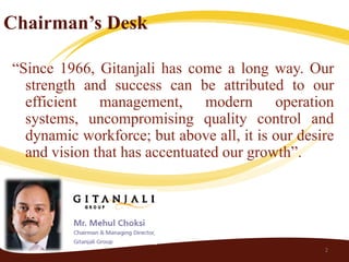 Gitanjali Gems is one of the largest manufacturers and retailers of diamonds and jewelry in India. It was founded in 1966 and has since grown significantly. The document discusses Gitanjali Gems' history and operations, provides an overview of the global and Indian gems and jewelry industry, and analyzes external and internal factors that have affected the company. It also outlines government initiatives to support the industry.