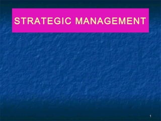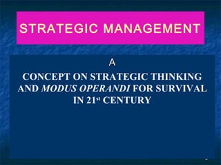 This document discusses strategic management and the need for strategic thinking in the 21st century. It notes that companies must operate with strategic competitiveness and sustained competitive advantages in order to survive amid discontinuing change, shrinking business and technology lifecycles, and shifting consumer preferences and demographics. It also discusses analyzing the external environment, including industries and competition, as well as developing strategic plans through vision, mission, objectives and crafting strategies. The strategic management process is characterized as ongoing, iterative and cross-functional.