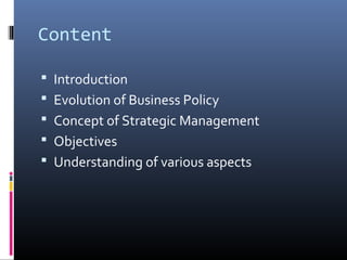The document discusses the evolution and concepts of business policy and strategic management. It evolved from ad hoc policy making to integrating functional areas to meet changing environments. Modern strategic management involves continuous strategic analysis, choice, implementation and evolution to relate organizational objectives and resources to opportunities. The objectives are to develop knowledge, skills, and attitudes for general management including understanding external/internal factors, decision making, and problem solving.