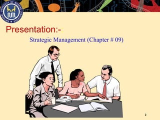 This document summarizes a presentation on strategic management. It defines strategic management and outlines the strategic management process. This includes identifying the organization's mission and goals, conducting external and internal analysis including SWOT analysis, formulating strategies, implementing strategies, and evaluating results. It also discusses different levels of organizational strategies, including corporate level strategies like growth, stability, and retrenchment strategies. Business level strategies include Miles and Snow's adaptation model, Porter's generic competitive strategies, and product life cycle analysis. Functional level strategies involve research and development, manufacturing, marketing, human resources, and finance. Current strategic issues and important strategies for today's environment are also summarized.