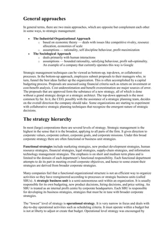 Strategic management involves three main processes: strategy formulation, strategy implementation, and strategy evaluation. Strategy formulation involves analyzing the internal and external environment to set objectives and develop a strategic plan. Strategy implementation allocates resources and establishes responsibility to achieve objectives. Strategy evaluation measures effectiveness by analyzing strengths, weaknesses, opportunities, and threats to determine if the strategy needs to be maintained or changed.