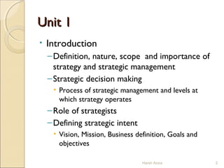 The document outlines the principles and practices of strategic management, focusing on the definition, nature, scope, and importance of strategy in achieving competitive advantage. It discusses the strategic management process, which encompasses analysis, formulation, implementation, and evaluation, as well as the roles of strategists in decision-making. Additionally, it highlights the significance of environmental appraisal, SWOT analysis, and the need for clear vision and mission statements in guiding organizational goals.
