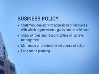 This document provides an overview of strategic management. It discusses key concepts like business policy, the nature and importance of business policy, limitations of business policy, and the process of formulating business policy. It also describes strategic management in terms of its beginning with a mission statement, preparation of a business portfolio, and periodic re-evaluation. The basic model of strategic management involves environmental scanning, strategy formulation and implementation, evaluation and control, and feedback. Vision, mission, objectives, strategic decision making, global strategic management, the impacts and barriers of globalization are also summarized.