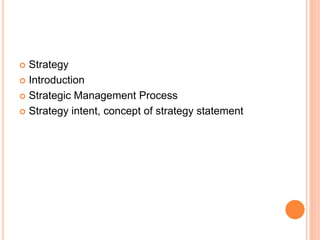 The document outlines the concept and importance of strategic management, emphasizing the development of strategies that bridge the gap between an organization's current position and its desired future state. It covers key components such as mission and vision statements, goals, and objectives, detailing how these elements guide organizational planning and performance. Strategic management is portrayed as essential for both small and large organizations to achieve competitive advantage and effective decision-making.