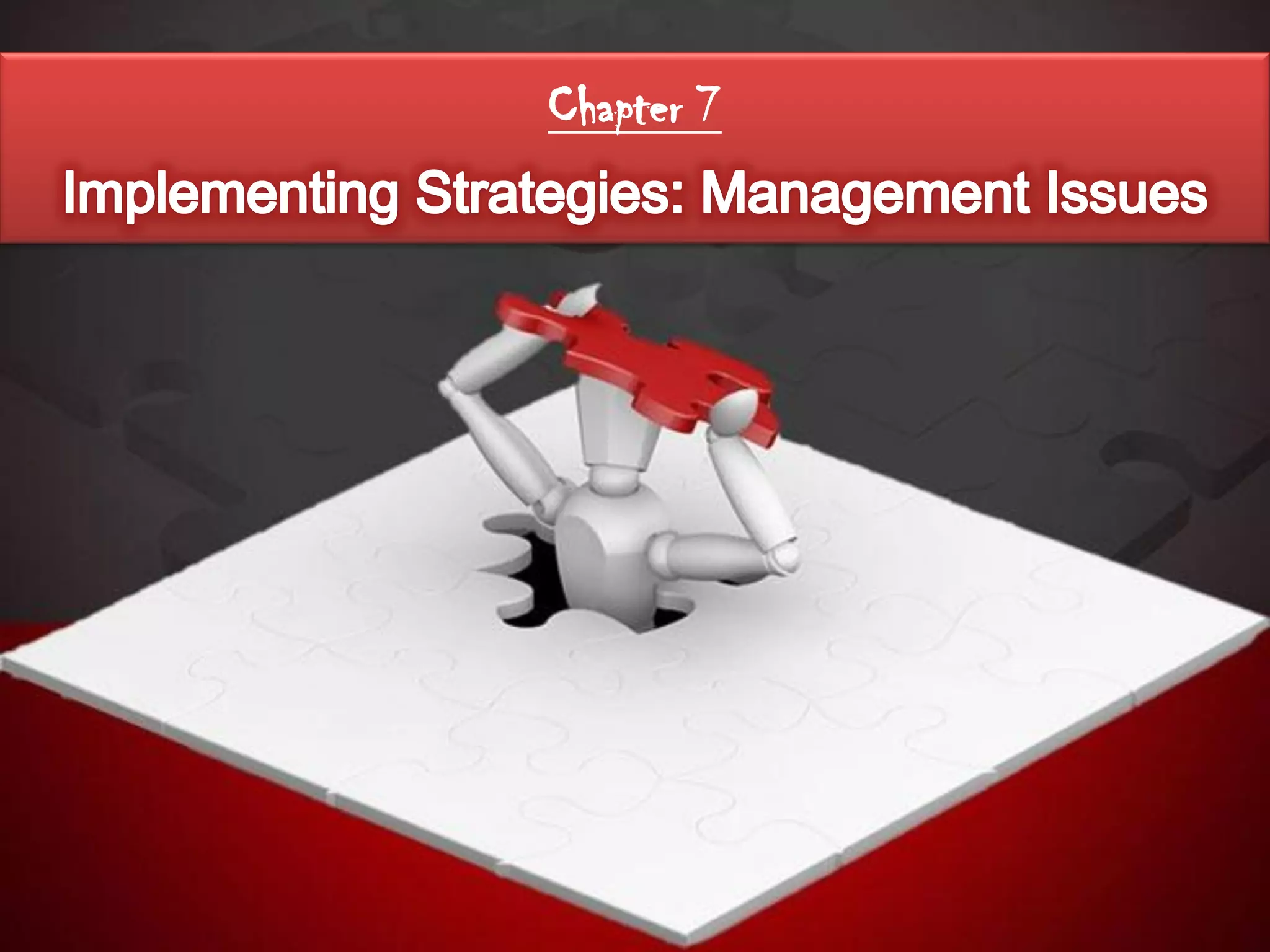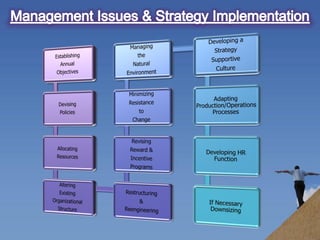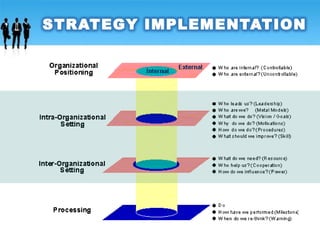 Strategy implementation involves organizing resources, building culture, and leading change to execute strategy. It requires coordination across functions and motivating managers and employees. Key aspects of implementation include allocating resources, setting policies and procedures, tying rewards to goals, and developing a strategy-supportive culture. Challenges can arise from transitioning responsibility to divisional managers with differing interests from the organization.