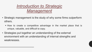 Strategic management involves analyzing a firm's internal strengths and weaknesses as well as external opportunities and threats to create and sustain a competitive advantage. It is a top-level management process that guides the overall vision, mission, objectives, and strategies across all functional areas of a business. An effective strategic management process includes environmental scanning, strategy formulation, implementation, and evaluation to ensure the business adapts to changes in the market. Firms that practice strategic planning see financial benefits like increased sales and profits as well as non-financial benefits like improved coordination and ability to adapt to changes.