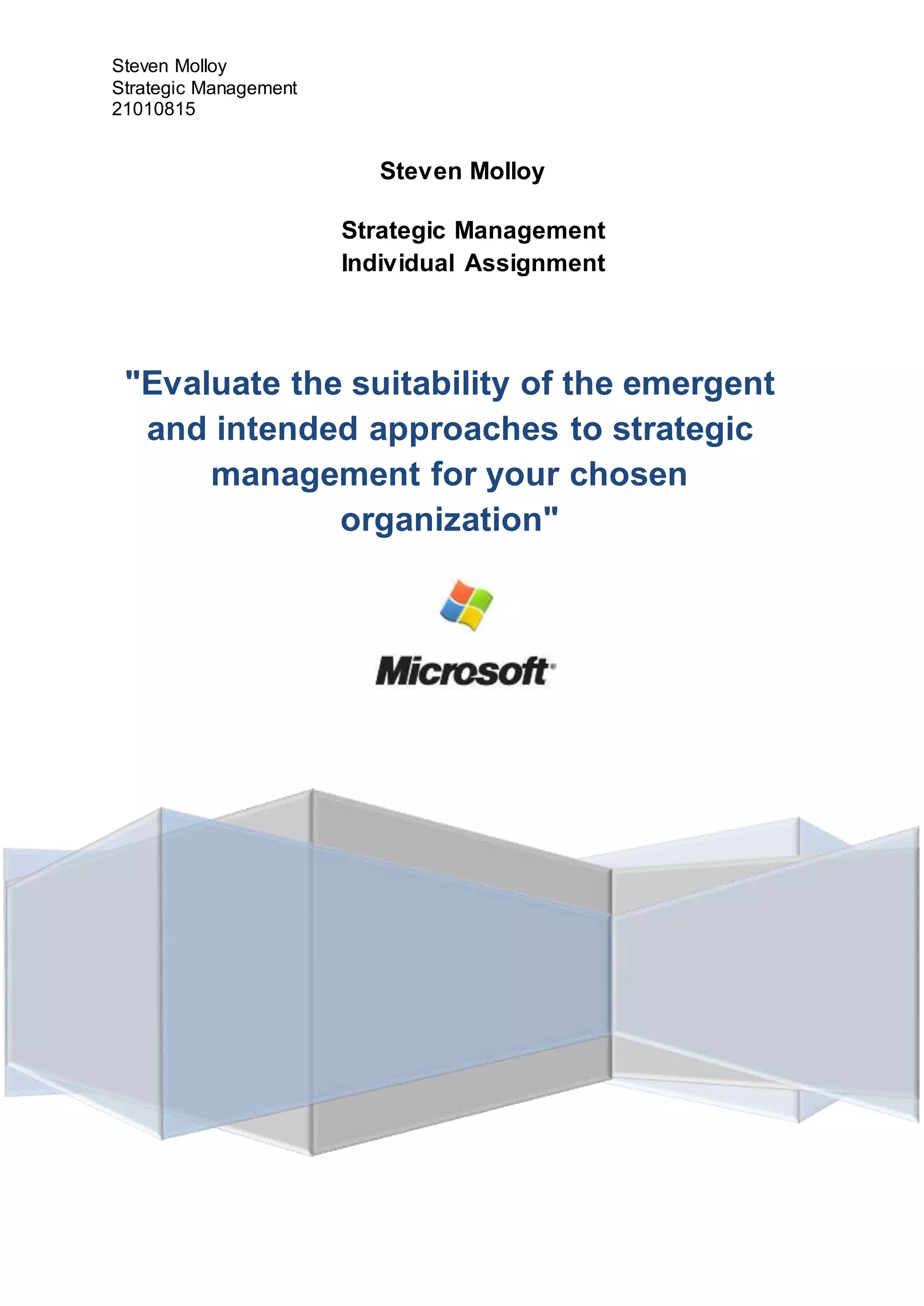 This document discusses Microsoft's use of intended and emergent strategies. It provides examples of Microsoft using an intended strategy when entering the gaming industry by developing a two-year plan for its Xbox console. This allowed Microsoft to carefully analyze the gaming market. The document also discusses Microsoft's emergent strategy of developing the Kinect in response to changing sociocultural trends of increasing health consciousness, allowing it to capitalize on a new market opportunity. While intended strategies provide clear planning, emergent strategies are better suited to adapting to changes in the external environment. The document argues that organizations should use a mix of intended and emergent strategies.