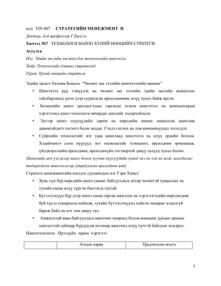 СТРАТЕГИЙН МЕНЕЖМЕНТ II Доктор, дэд профессор Г.Билгээ Хичээл №7 ТЕХНОЛОГИ БОЛОН ХҮНИЙ НӨӨЦИЙН СТРАТЕГИ Агуулга Нэг. Эдийн засгийн хөгжил дэх технологийн шинэчлэл Хоёр. Технологийн дэвшил стратегид Гурав. Хүний нөөцийн стратеги Эдийн засагч Уильям Бомоль “Чөлөөт зах зээлийн шинэчлэлийн машин” • Шинэчлэл рүү тэмүүлэх нь чөлөөт зах зээлийн эдийн засгийн амжилтыг тайлбарлахад үнэн дээр суурилсан өрсөлдөөнөөс илүү чухал байж ирсэн. • Бизнесийн шинэ оролцогчдын гаргасан огцом шинэчлэл нь компьютерын хэрэглээнд шинэ технологи авчирдаг циклийг тодорхойлсон. • Эдгээр шинэ пүүсүүдийн зарим нь өөрсдийн өмнөх амжилтаа ашиглаж давамгайлагч тоглогч болж чаддаг. Гэхдээ ихэнх нь том компаниуудад эзлэгддэг. • Сүйрлийн технологийг нэг удаа ашиглаад шинэчлэл нь илүү ердийн болсон. Хэдийчинээ олон пүүсүүд энэ технологийг эзэмшинэ, өрсөлдөөн эрчимжиж, үйлдвэрлэлийн өрсөлдөөн, өрсөлдөхүйц тогтвортой давуу талууд чухал болно. (Бомолийн авч үзсэнээр шинэ болон хуучин пүүсүүдийн хувьд энэ нь хэн нь ялж, ялагдахыг тодорхойлох шинэчлэлээр удирдуулсан өрсөлдөөн юм) Стратеги менежментийн шилдэг судлаачдын нэг Гэри Хамел • Хувь хүн бүр өөрсдийн шинэ санааг байгууллага дотор чөлөөтэй хуваалцах нь тухайн санаа илүү түргэн биелэхэд тустай • Бүтээгдэхүүн бүр дээр шинэ санаа гарган ажиллах нь хэрэглэгчдийн өөрчлөгдөж буй хүсэл сонирхолд нийцэж, тухайн бүтээгдэхүүнд хийсэн чанарыг алдалгүй барьж байх нь нэг том давуу тал. • Амжилттай яваа байгууллага ажилчин хооронд болон компани дундах орчныг хангалттай сайнаар бүрдүүлж өгснөөр ажилчид илүү хүчтэй байдлыг мэдэрнэ. Нанотехнологи: Ирээдүйн зарим хэрэглээ Алсын хараа Урьдчилсан мэдээ
