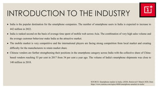 2. The smartphone industry in India is highly competitive with Chinese vendors increasing market share. OnePlus targets online sales and builds a loyal customer community.
